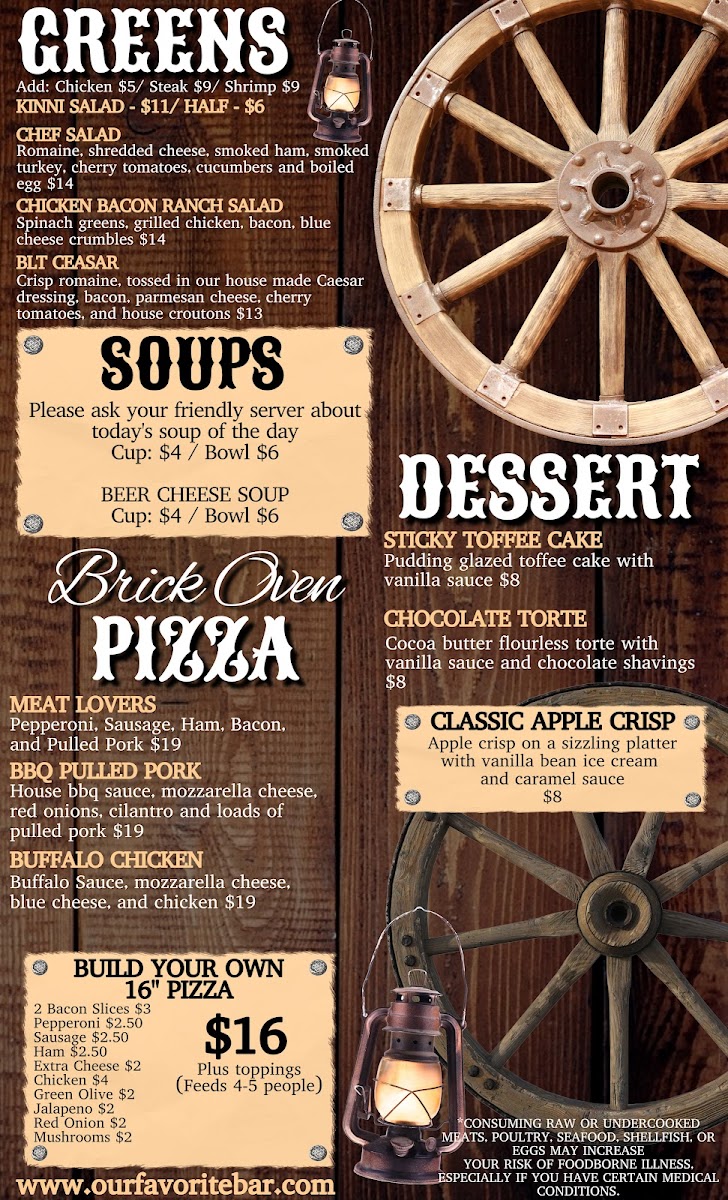 Enjoy a unique decor with whimsical touches like wagon wheel light fixtures and playful signs.